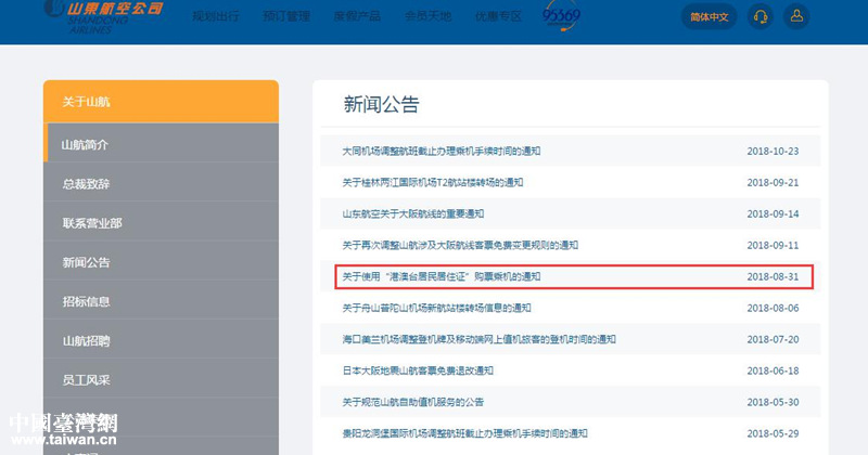 山航通過官網(wǎng)等平臺向社會公眾告知惠臺政策和有關(guān)規(guī)定。(圖片來源:山東省臺港澳辦)