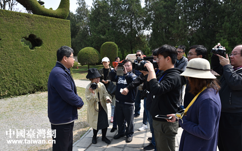 淮陽太昊陵管理處主任雷鐵梁向兩岸媒體記者介紹伏羲文化和姓氏文化。(圖片來源:周口市臺(tái)辦)