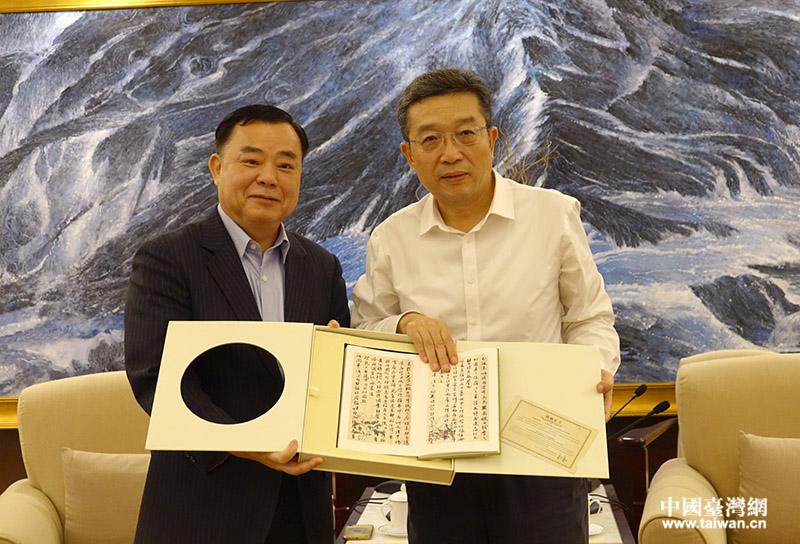 中共上海市委常委鄭鋼淼會(huì)見(jiàn)桃園市議會(huì)議長(zhǎng)邱奕勝率領(lǐng)的桃園市里長(zhǎng)聯(lián)誼總會(huì)參訪團(tuán)一行。圖為雙方交換禮物。(來(lái)源:上海市臺(tái)辦)