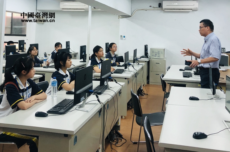 臺灣師范大學(xué)楊智翔博士(右一)向?qū)W生們講授“機(jī)械手臂課”(圖片來源:四川省廣元市臺辦)