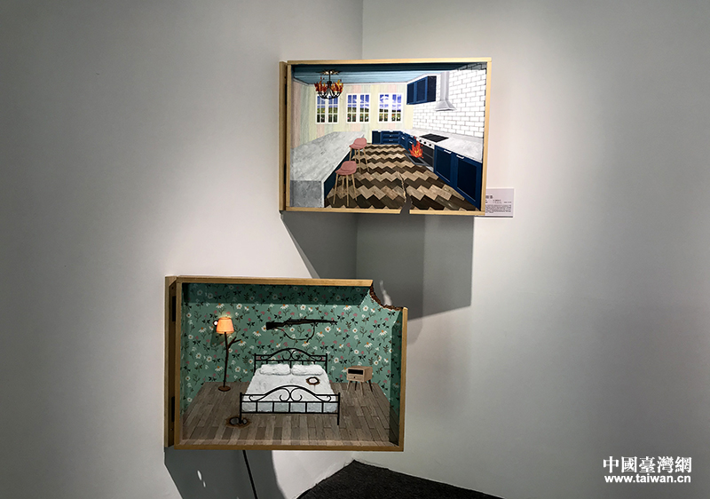 據(jù)介紹,此次聯(lián)展共有臺灣5所高校的84位同學作品參展。記者在現(xiàn)場看到,高雄師范大學的許玟蒂帶來了用復合材料制作的兩幅畫作《早餐》和《該睡了》。其畫作于舒適環(huán)境畫面中以威脅性方式破壞畫面的安寧,以表達青年人在工業(yè)化、科技化文明便利和秩序中隱含的不安和焦慮。