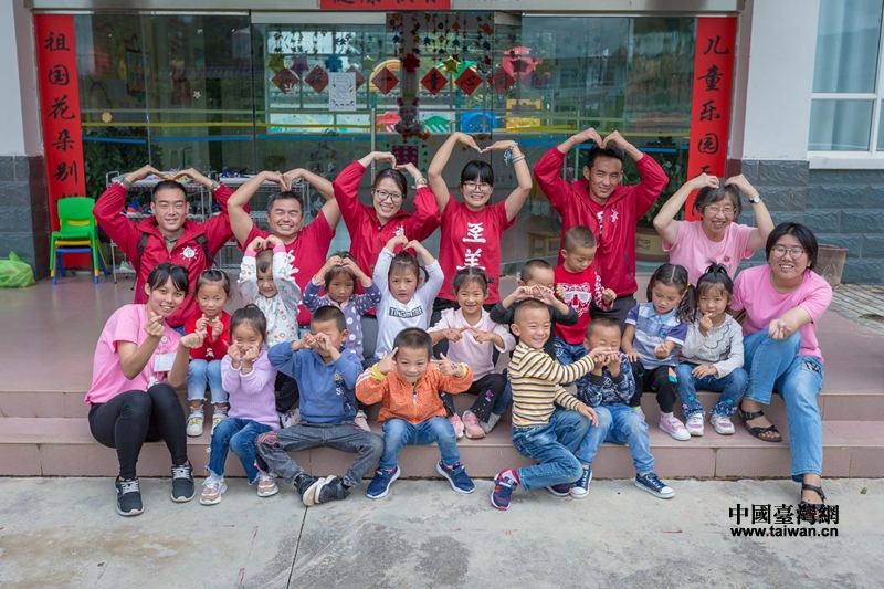 至善基金會(huì)一行和海東幼兒園小朋友在一起(圖片來(lái)源:麗江市委臺(tái)辦)