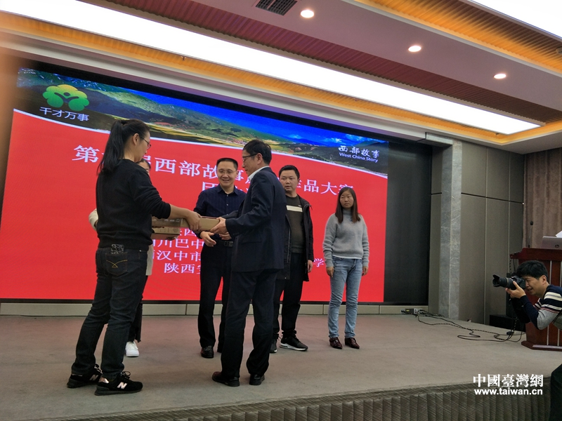 會(huì)上為獲得“西部故事”原創(chuàng)作品大賽代表頒發(fā)獎(jiǎng)品。(圖片來源:甘肅省臺(tái)辦)