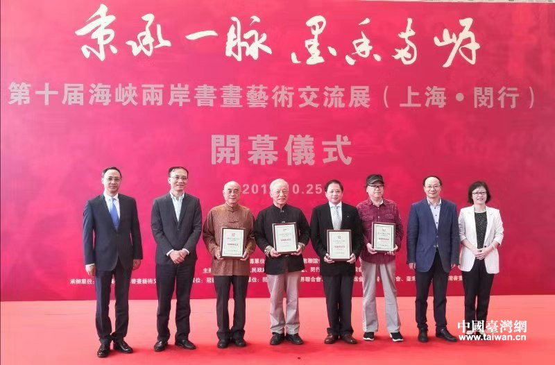 中國臺灣網(wǎng)10月28日訊 秋天的申城大地景致正美。10月25日上午,由上海海峽兩岸書畫藝術(shù)交流會承辦,閔行區(qū)文聯(lián)、臺灣光彩促進會、臺灣祥簋書會、臺灣中華畫院、臺灣書畫篆刻研究會協(xié)辦的“秉承一脈墨香兩岸”——第十屆海峽兩岸書畫藝術(shù)交流展(上海.閔行)在海派藝術(shù)館開幕。來自臺灣的27名書畫藝術(shù)家、上海海峽兩岸書畫藝術(shù)交流會30多名書畫藝術(shù)家、閔行區(qū)各街、鎮(zhèn)、莘莊工業(yè)區(qū)黨委(黨工委)、臺聯(lián)分會長、市臺協(xié)會閔行工委會負(fù)責(zé)人和臺商、臺胞代表近三百人參加。