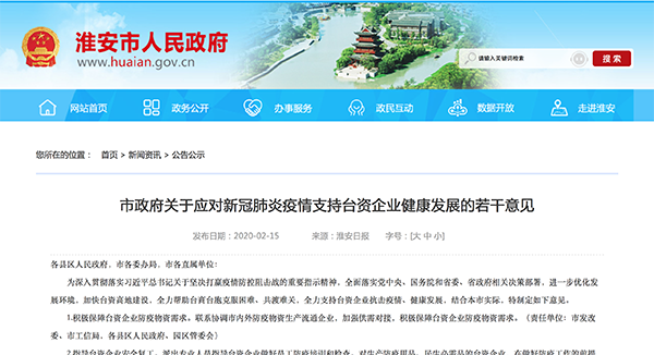 在保證臺(tái)資企業(yè)享受同等待遇方面,明確符合條件的各類在淮臺(tái)資企業(yè),同等適用《市政府關(guān)于應(yīng)對(duì)新型冠狀病毒感染的肺炎疫情支持中小微企業(yè)平穩(wěn)健康發(fā)展的政策意見》。