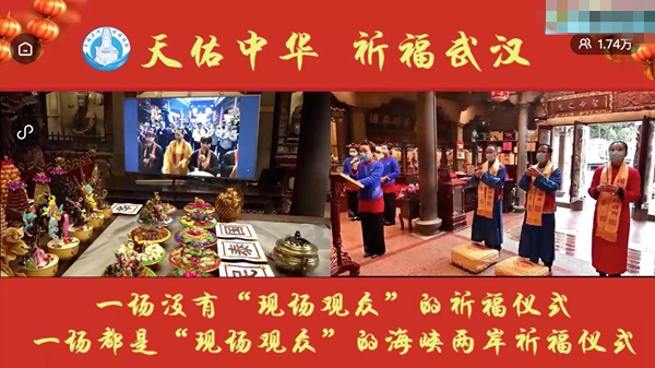 隔著一灣淺淺的海峽,兩岸宮廟在視頻屏幕中共同舉行莊嚴(yán)肅穆的三獻(xiàn)禮。林金贊說:“兩岸一家親,今天兩岸媽祖宮廟通過網(wǎng)絡(luò)連線,共同舉行“天佑中華 祈福武漢”活動,祈愿中華民族繁榮昌盛,疫情早日解除!”。