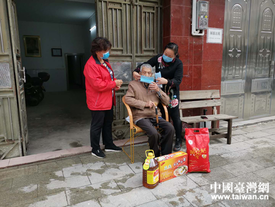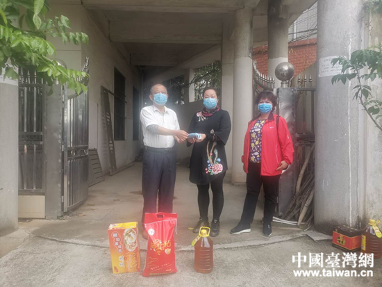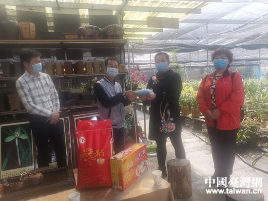 廣西玉林市容縣臺辦主任曾漢萍到臺胞葉國斌蘭花園走訪,送上口罩和生活物資。 (中國臺灣網 發(fā))