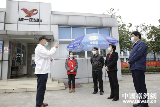 李東興、趙宏明在南寧統(tǒng)一企業(yè)有限公司查看企業(yè)防護(hù)措施和防控物資儲備情況。 (中國臺灣網(wǎng) 發(fā))