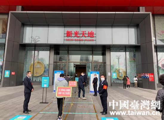 新光天地商場門口設(shè)體溫檢測口。 (中國臺灣網(wǎng) 發(fā))