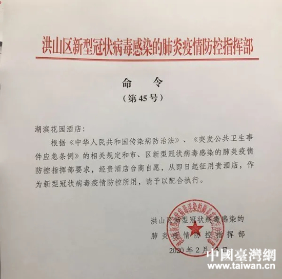武漢市洪山區(qū)防疫指揮部下文,經(jīng)臺(tái)商自愿,征用湖濱花園酒店為防疫隔離點(diǎn)。 (中國臺(tái)灣網(wǎng) 發(fā))