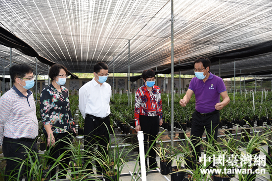 李東興在廣西笠震蘭文化旅游有限公司蘭花示范基地了解基地建設(shè)及防疫情況。 (中國臺灣網(wǎng) 發(fā))