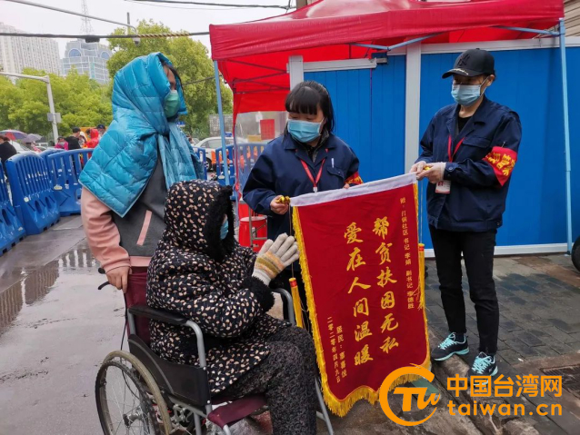 康復(fù)后外婆和臺胞姐妹送社區(qū)書記倪娟錦旗(圖片來源:武漢市臺辦)