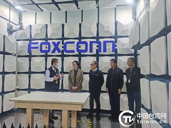 廣西臺(tái)辦主任李莉(左二)、副主任趙紅明(右二)在南寧富士康科技園區(qū)檢測(cè)中心實(shí)驗(yàn)室調(diào)研。(廣西南寧市臺(tái)辦供圖)