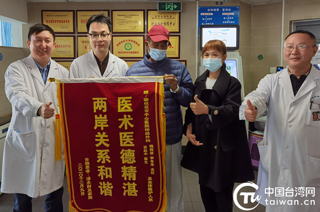 中國(guó)臺(tái)灣網(wǎng)12月21日訊 12月10日上午,臺(tái)商潘先生的妻子范女士將一面寫有“醫(yī)術(shù)醫(yī)德精湛 兩岸關(guān)系和諧”的錦旗送到了四川攀枝花市中心醫(yī)院神經(jīng)疾病中心,對(duì)該中心醫(yī)護(hù)人員一個(gè)多月以來對(duì)潘先生的精心治療和細(xì)心照護(hù)表示感謝。