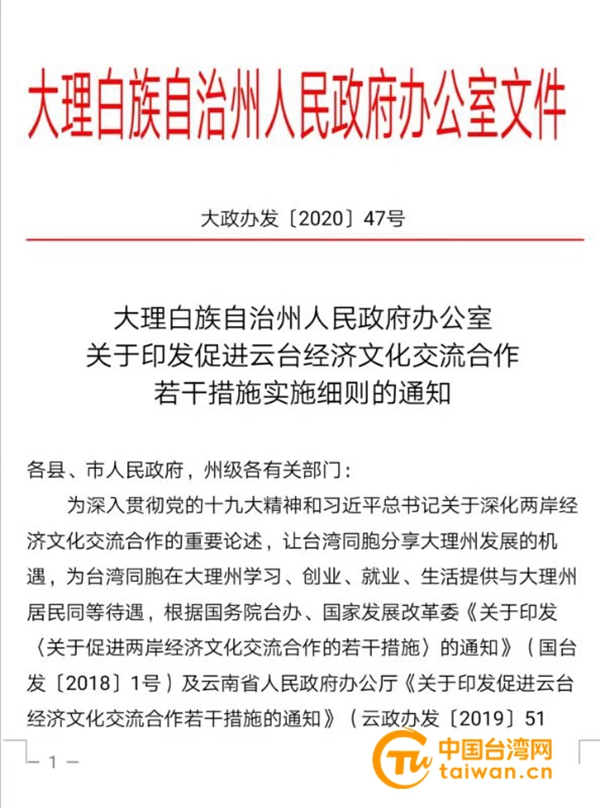 中國臺灣網(wǎng)1月22日訊 為深入貫徹黨的十九大精神和習(xí)近平總書記關(guān)于深化兩岸經(jīng)濟(jì)文化交流合作的重要思想,積極踐行“兩岸一家親”理念,讓臺灣同胞分享云南省大理州發(fā)展機(jī)遇,為臺灣同胞在大理州學(xué)習(xí)、創(chuàng)業(yè)、就業(yè)、生活提供與大理州居民同等待遇,大理州結(jié)合實(shí)際,制定出臺了《大理白族自治州人民政府辦公室關(guān)于印發(fā)促進(jìn)云臺經(jīng)濟(jì)文化交流合作若干措施實(shí)施細(xì)則的通知》(以下簡稱大理州惠臺“50條措施”)。