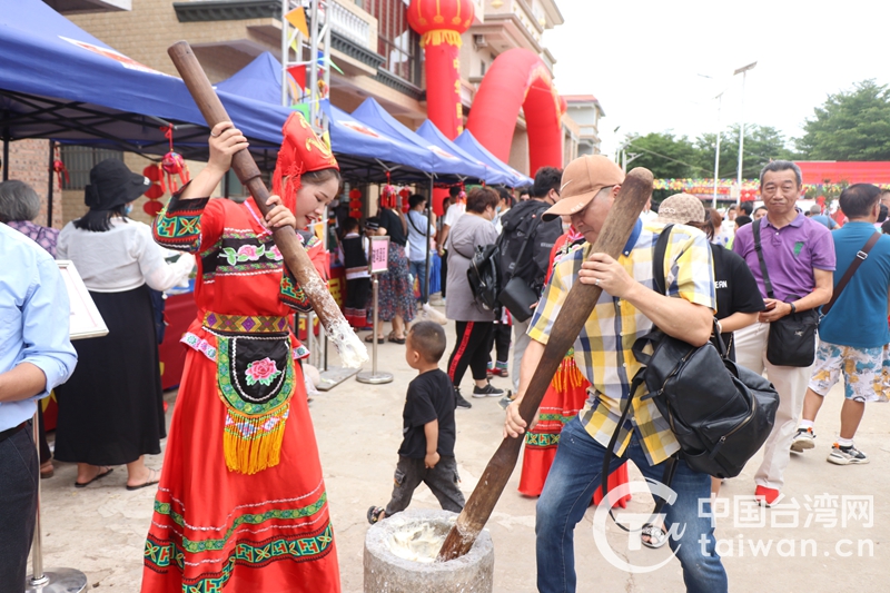 臺(tái)胞與壯族鄉(xiāng)親一起打糍粑(圖片來(lái)源:廣西北海市臺(tái)辦)
