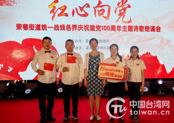 中國臺灣網6月17日消息 近日,由無錫濱湖區(qū)臺辦、榮巷街道聯(lián)合舉辦的“紅心向黨”榮巷街道統(tǒng)一戰(zhàn)線各界慶祝建黨100周年主題詩歌朗誦會在榮巷街道黨群活動中心舉行。來自街道的臺青臺屬、僑胞僑眷、民主黨派人士、科研院所黨外知識分子、新的社會階層人士等統(tǒng)一戰(zhàn)線各領域成員代表及居民代表共計百余人歡聚一堂,畫出最美同心圓。