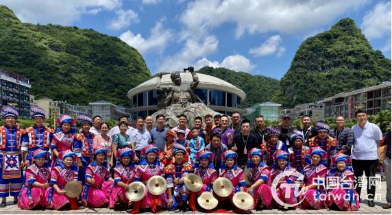 臺青參訪團與馬山會鼓表演者合影。(圖片來源:廣西臺辦)