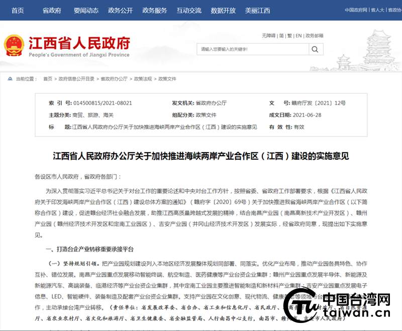 江西省人民政府網(wǎng)站截圖(中國臺灣網(wǎng)發(fā))