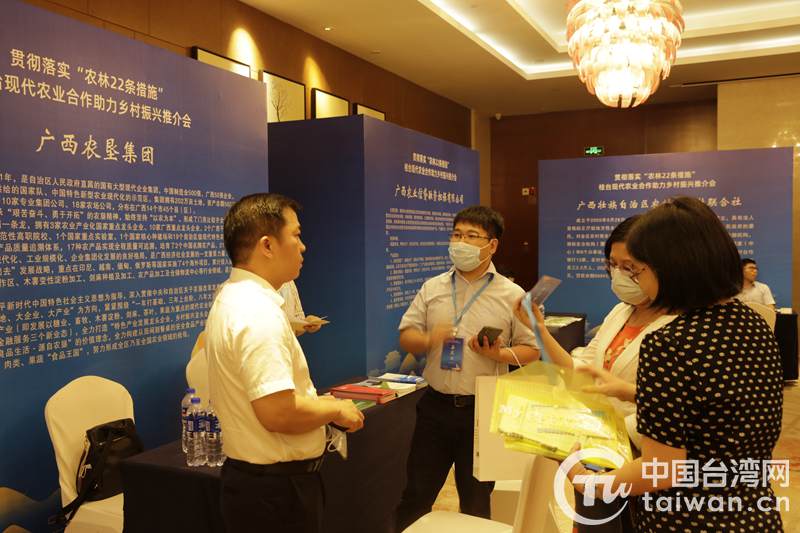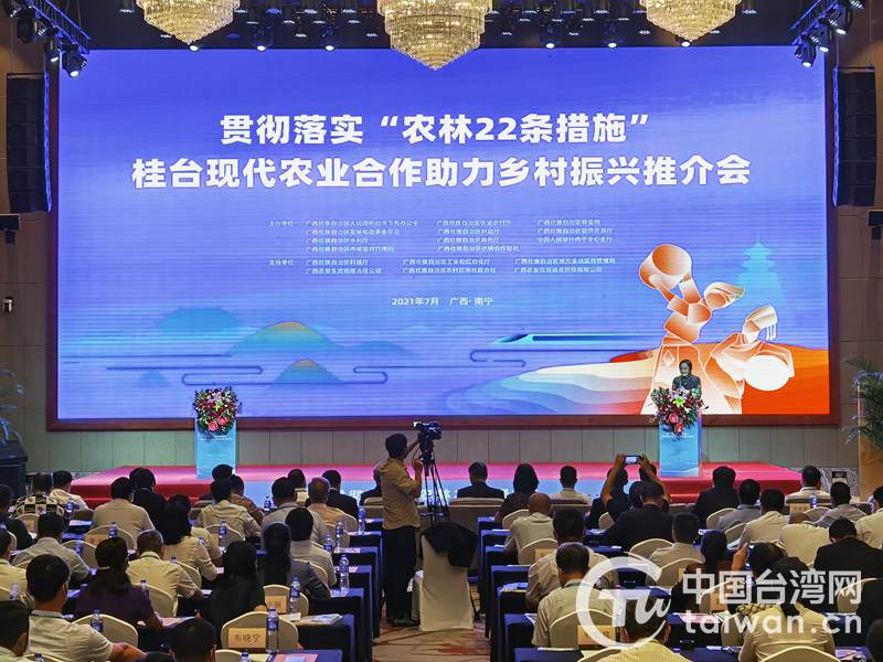 中國臺灣網(wǎng)7月21日訊 7月19日,廣西壯族自治區(qū)臺辦、農(nóng)業(yè)農(nóng)村廳、林業(yè)局等17家單位在廣西南寧共同舉辦“貫徹落實‘農(nóng)林22條措施’桂臺現(xiàn)代農(nóng)業(yè)合作助力鄉(xiāng)村振興推介會”,探索“十四五”桂臺現(xiàn)代農(nóng)業(yè)合作方向、路徑和模式,引導(dǎo)涉農(nóng)臺資企業(yè)適應(yīng)新發(fā)展階段,貫徹新發(fā)展理念,融入新發(fā)展格局,積極參與鄉(xiāng)村振興戰(zhàn)略,扎實推動桂臺農(nóng)業(yè)融合發(fā)展邁上新臺階。國家有關(guān)部門業(yè)務(wù)負責(zé)人,兩岸從事農(nóng)業(yè)及相關(guān)產(chǎn)業(yè)企業(yè)家代表,兩岸專家、學(xué)者,廣西壯族自治區(qū)及各市相關(guān)主管部門代表,涉農(nóng)金融機構(gòu)代表等150余人出席會議。