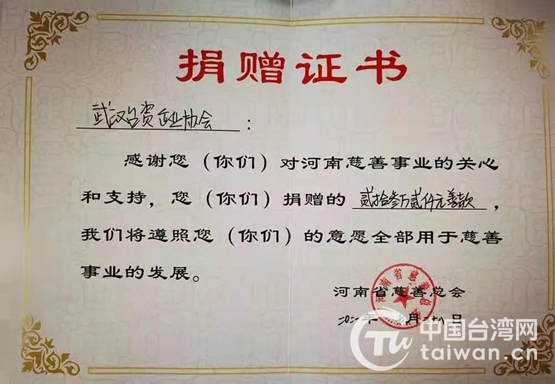 截至目前,武漢臺資企業(yè)協(xié)會將已收到的捐款合計(jì)人民幣23.2萬元,匯至河南省慈善總會“防汛抗洪馳援河南”慈善項(xiàng)目接收捐款專戶。河南省慈善總會發(fā)來捐贈證書,表示感謝。