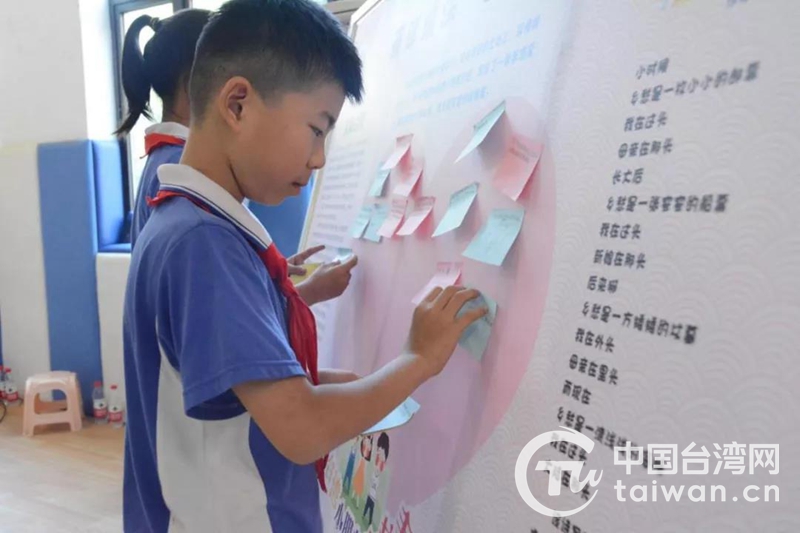 仰天湖金峰小學(xué)的同學(xué)們紛紛將自己對(duì)祖國(guó)統(tǒng)一的期待和對(duì)臺(tái)灣小朋友的祝福貼在“兩岸情深 心手相牽”祝福墻上。