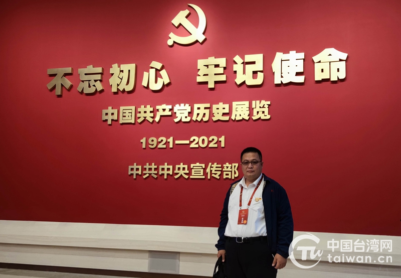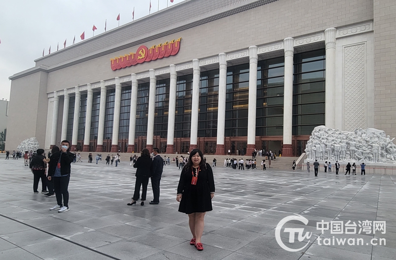 王孟筠在中國共產(chǎn)黨歷史展覽館前留影(圖片來源:廣西臺(tái)辦)