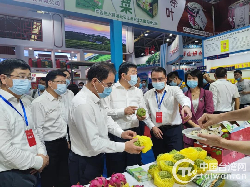 廣西壯族自治區(qū)副主席方春明(左四)、廣東省委常委葉貞琴(左三)到桂臺(tái)農(nóng)業(yè)精品展巡展,廣西臺(tái)辦副主任林承格(左五)作介紹。(圖片來(lái)源:廣西臺(tái)辦)