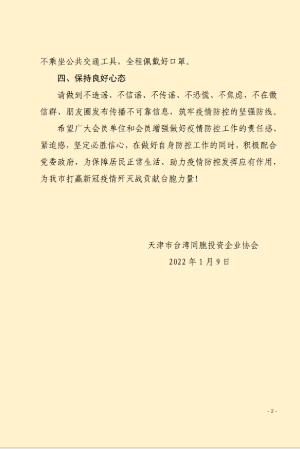 天津市臺企協(xié)會號召會員堅決服從疫情防控部署,為打贏疫情防控殲滅戰(zhàn)貢獻(xiàn)力量