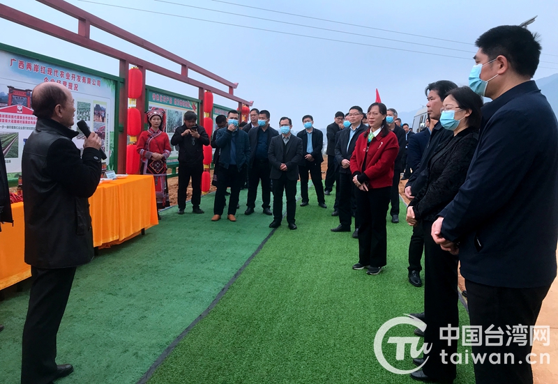 莊久毅(左一)向富川縣有關(guān)領(lǐng)導(dǎo)介紹企業(yè)發(fā)展情況(圖片來源:廣西賀州市臺辦)