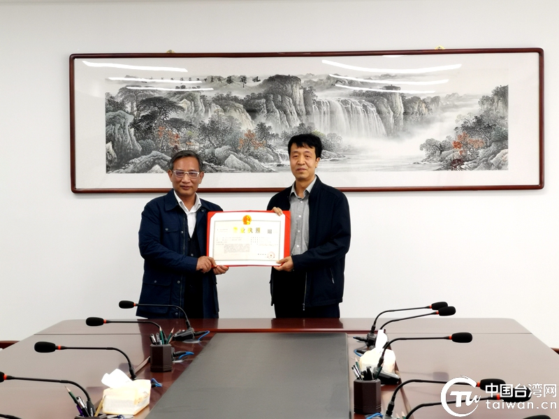 晉中市臺辦主任張國新將《山西零點(diǎn)倍增產(chǎn)業(yè)園運(yùn)營管理有限公司營業(yè)執(zhí)照》交到臺灣青年聯(lián)合會融媒體中心主任洪盛興手中。(圖片來源:晉中市臺辦)