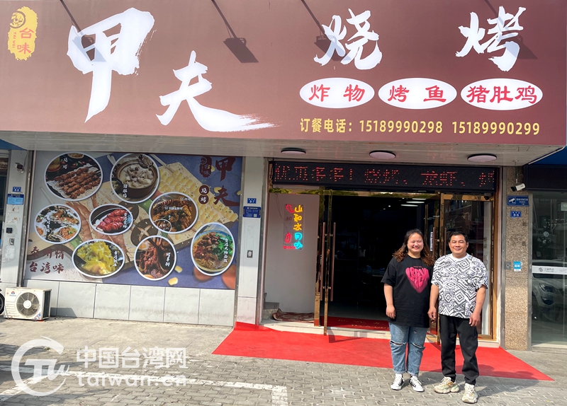 夫妻倆與小吃店合影(圖片來源:泰州市海陵區(qū)臺(tái)辦)