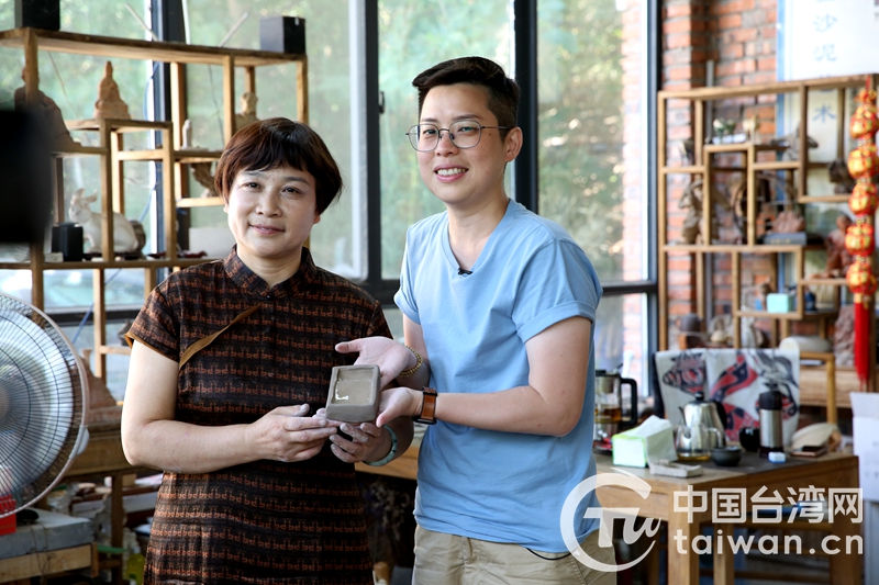 黃愷嘉制作黃河澄泥硯后與王玲老師合影(圖片來源:河南省臺(tái)辦)