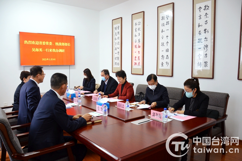 中國臺灣網(wǎng)11月14日訊 近日,吉林省委常委、統(tǒng)戰(zhàn)部部長吳海英到省委臺辦走訪調(diào)研,全面了解全省對臺工作情況,并與省委臺辦領(lǐng)導(dǎo)班子和機關(guān)干部圍繞學(xué)習(xí)貫徹黨的二十大精神開展座談交流。