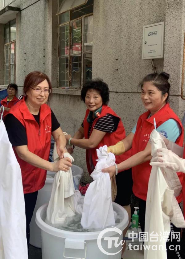 臺(tái)灣同胞賴麗卿和隊(duì)員們清洗學(xué)校演出服裝(圖片來源:珠海市委臺(tái)港澳辦)