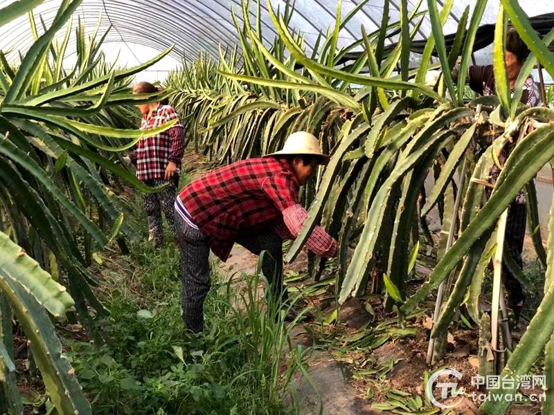 這里是臺(tái)資農(nóng)企四川廣綠農(nóng)業(yè)科技有限公司的紅心火龍果大棚基地,自入春以來,廣綠農(nóng)業(yè)的火龍果大棚里,早已呈現(xiàn)一片熱鬧的春耕備耕場(chǎng)景,每天30多名工人細(xì)心地為果樹修枝、除草、培土、施肥,栽種培育新的火龍果苗。