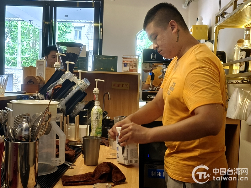 臺青彭昱凱在新開的咖啡店忙碌(圖片來源:北海市臺辦)