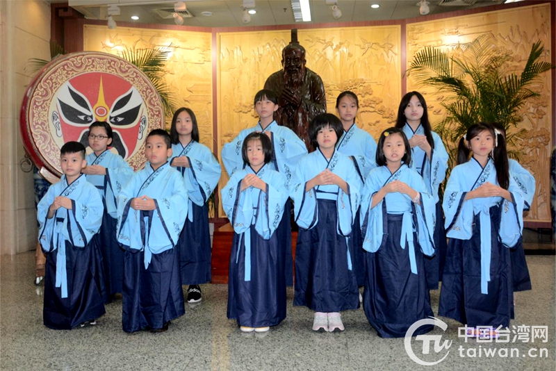 臺(tái)灣學(xué)生和家長(zhǎng)們首先參加了開(kāi)蒙禮儀式,法圣賢正衣冠、敬先賢拜孔子、點(diǎn)朱砂啟童智、擊響鼓明遠(yuǎn)志,研習(xí)中華傳統(tǒng)禮儀文化。