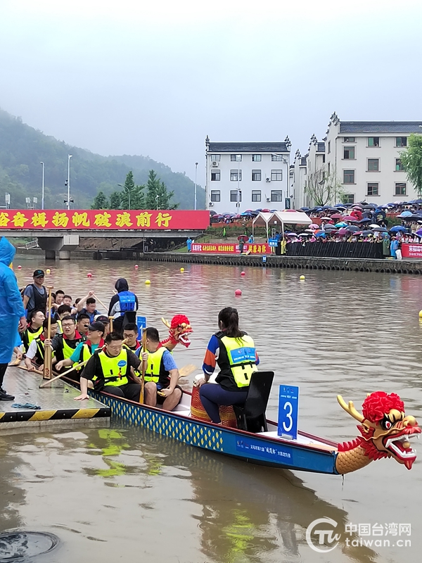 “下雨寓意著風(fēng)調(diào)雨順、端午安康!爆F(xiàn)場,義烏臺青、臺聯(lián)青委組成一支12人龍舟隊,隊員們高喊著“臺青同心,加油、加油”的口號,奮力揮槳,浪花激蕩心弦,岸上鼓聲震天,觀眾喝彩連連。