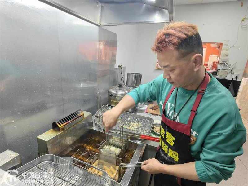 位于江漢區(qū)北湖正街的“臺(tái)客鹽酥雞”店內(nèi),潘佳輝正在專心制作炸品。(中國(guó)臺(tái)灣網(wǎng)發(fā))