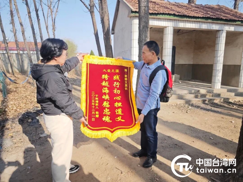 今年8月,于雪燕通過網絡了解到劉德文多年來協(xié)助老兵魂歸故里的事跡,隨即與他取得聯(lián)系。劉德文輾轉查詢、幾經核對,在臺灣彰化縣找到于樹增生前居住的養(yǎng)老院以及骨灰安葬地。劉德文是臺灣高雄市一位里長,自2003年起,他已先后護送300多位老兵的骨灰回到大陸故鄉(xiāng)安葬,其中山東籍老兵有72位。為了感謝劉德文的幫助,于雪燕將印有“踐行初心擔道義 跨越海峽慰忠魂”的錦旗送給劉德文。