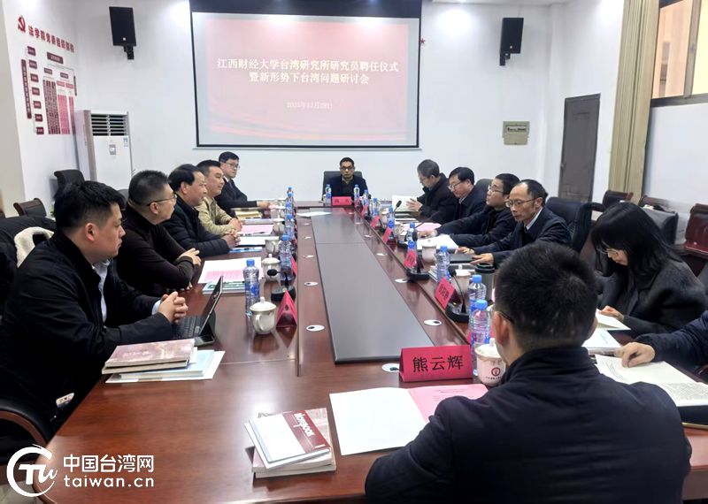 中國臺灣網1月4日訊 為進一步提升江西省涉臺研究水平,在江西省臺辦的大力支持下,12月29日,江西財經大學臺灣研究所研究員聘任儀式暨新形勢下臺灣問題研討會在南昌召開,現場為研究員頒發(fā)聘書,組織大家開展研討交流。江西省臺辦二級巡視員江雷,江西財經大學黨委常委、副校長賀丹君出席。