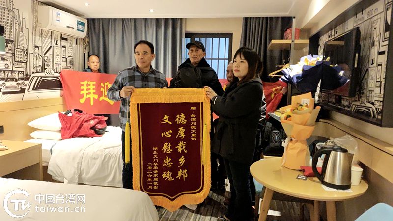 去臺老兵華榮清親屬向臺胞劉德文贈送錦旗。(中國臺灣網(wǎng)發(fā))