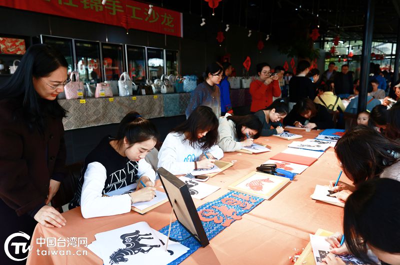 兩岸姐妹體驗非遺壯錦技藝。(中國臺灣網(wǎng)發(fā))