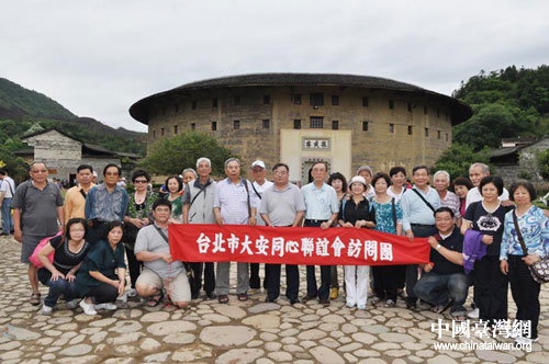 中國臺灣網5月16日永定消息 日前,臺北市大安同心聯(lián)誼會訪問團一行25人到永定土樓參觀訪問。永定縣人大常委會楊德如副主任、永定縣臺灣事務辦公室林熙賢主任前往湖坑鎮(zhèn)接待、陪同。圖為參訪團成員在振成樓前合影。(中國臺灣網、福建省永定縣臺辦聯(lián)合報道)