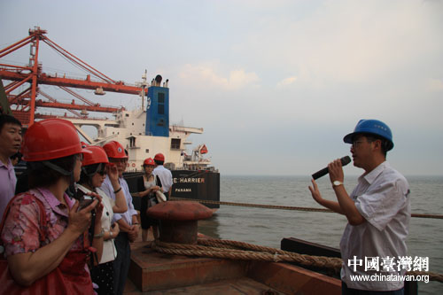 參加“第四屆海峽兩岸企業(yè)發(fā)展與合作論壇”的嘉賓和代表在曹妃甸礦石碼頭聽取工程師的介紹。(中國臺灣網(wǎng) 肖燕 攝)
