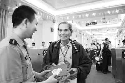 今年是媽祖誕辰1050周年,首個(gè)以整船、包船形式赴媽祖故鄉(xiāng)朝圣的臺(tái)灣進(jìn)香團(tuán)352名臺(tái)胞,6月18日乘坐“海洋拉拉”號(hào)客輪從臺(tái)灣臺(tái)中港出發(fā),于中午1時(shí)抵達(dá)福建莆田湄洲島宮下新碼頭。83高齡的臺(tái)胞蔡明森是352名旅客中年齡最大的,剛踏進(jìn)驗(yàn)放通道,他就收到莆田邊防檢查站官兵送上的禮物——中國(guó)結(jié)。(吳志 攝)