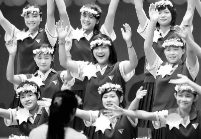 7月19日,“2010滬臺(tái)青少年走進(jìn)世博”千人夏令營(yíng)在上海東方藝術(shù)中心舉行開(kāi)營(yíng)式暨文藝演出。來(lái)自滬臺(tái)兩地各16所中學(xué)的1600余名師生將在夏令營(yíng)期間參觀上海世博會(huì),并舉行系列豐富多彩的活動(dòng)以加深了解,共享世博。圖為臺(tái)灣嘉義宏仁女中的學(xué)生在表演合唱節(jié)目。新華社記者 劉穎攝