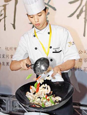 第二屆杭州美食文化節(jié)22日起至27日止在臺中市舉行,22日的品監(jiān)會上,來自杭州的廚師,現(xiàn)場炒出一盤“荷塘小炒”,頓時菜香撲鼻,令人垂涎三尺。圖片來源:臺灣《中國時報》