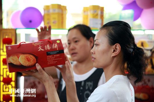 9月17日,“臺中縣農(nóng)特產(chǎn)品瑞和泰直銷專柜”在江蘇常州市開業(yè),圖為常州市民在專柜區(qū)選購農(nóng)特產(chǎn)品太陽餅。(中國臺灣網(wǎng) 鐘寶華 攝)